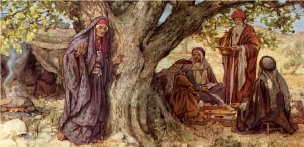 Genesis 18. 1.The Lord appeared to Abraham near the great trees of Mamre while he was sitting at the entrance to his tent in the heat of the day. 2. Abraham looked up and saw three men standing nearby. When he saw them, he hurried from the entrance of his tent to meet them and bowed low to the ground.9. “Where is your wife Sarah?” they asked him. “There, in the tent,” he said. 10. Then one of them said, “I will surely return to you about this time next year, and Sarah your wife will have a son.” Now Sarah was listening at the entrance to the tent, which was behind him.