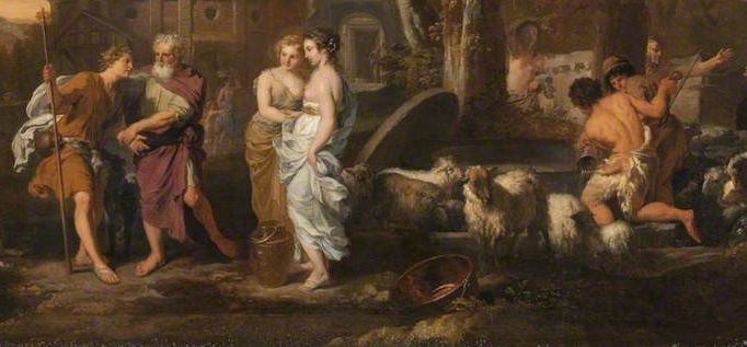 1 Mózes 29.10. S lőn, a mint meglátá Jákób Rákhelt, Lábánnak az ő anyja bátyjának leányát, és Lábánnak az ő anyja bátyjának juhait, odalépett Jákób és elgördíté a követ a kút szájáról, és megitatá Lábánnak az ő anyja bátyjának juhait. 11. És megcsókolá Jákób Rákhelt, és nagy felszóval síra. 12. S elbeszélé Jákób Rákhelnek, hogy ő az ő atyjának rokona és hogy Rebekának fia.