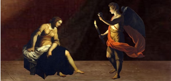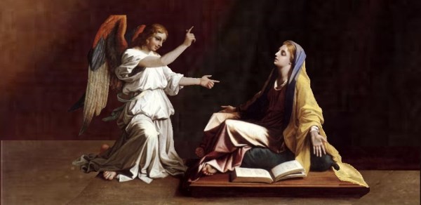 Lukács 1. 26. A hatodik hónapban pedig elküldeték Gábriel angyal Istentől Galileának városába. 27. Egy szűzhöz, a ki a Dávid házából való József nevű férfiúnak volt eljegyezve. A szűznek neve pedig Mária. 28. És bemenvén az angyal ő hozzá, monda néki: Örülj, kegyelembe fogadott! Az Úr veled van, áldott vagy te az asszonyok között. 29. Az pedig látván, megdöbbene az ő beszédén, és elgondolkodék, hogy micsoda köszöntés ez?!