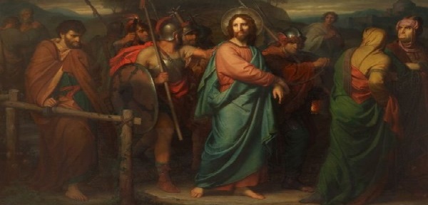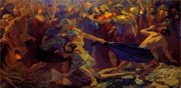 Márk 14.42. Keljetek föl, menjünk: ímé elközelgett, a ki engem elárul. 43. És mindjárt még mikor ő szól vala, eljöve Júdás, egy a tizenkettő közül, és vele együtt nagy sokaság, fegyverekkel és botokkal, a főpapoktól, az írástudóktól és a vénektől. 44. Az ő elárulója pedig jelt ada nékik, mondván: A kit megcsókolok majd, ő az; fogjátok meg azt, és vigyétek el biztonsággal.