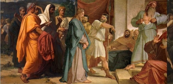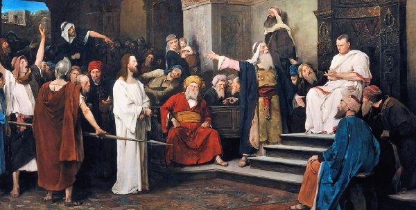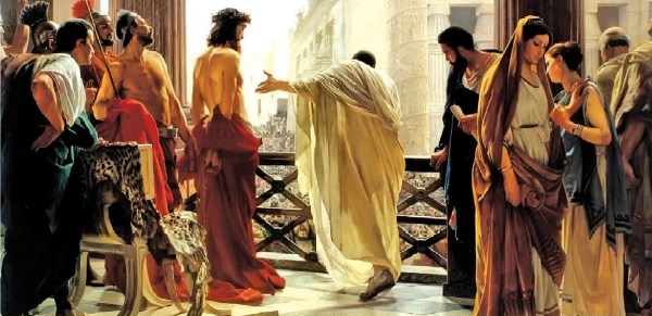 Márk 15. 2. És megkérdé őt Pilátus: Te vagy-é a zsidók királya? Ő pedig felelvén, monda néki: Te mondod. 3. És erősen vádolják vala őt a főpapok. 4. Pilátus pedig ismét megkérdé őt, mondván: Semmit sem felelsz-é? Ímé, mennyi tanúbizonyságot szólnak ellened! 5. Jézus pedig semmit sem felele, annyira hogy Pilátus elcsudálkozék.