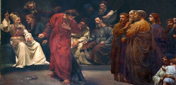 Márk 14. 60. Akkor a főpap odaállván a középre, megkérdé Jézust, mondván: Semmit sem felelsz-é? Miféle bizonyságot tesznek ezek te ellened? 61. Ő pedig hallgat vala, és semmit sem felele. Ismét megkérdezé őt a főpap, és monda néki: Te vagy-é a Krisztus, az áldott Isten Fia? 62. Jézus pedig monda: Én vagyok. És meglátjátok majd az embernek Fiát ülni a hatalomnak jobbján, és eljőni az ég felhőivel. 63. A főpap pedig megszaggatván ruháit, monda: Mi szükségünk van még tanúkra?