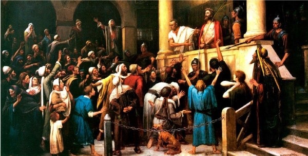 Márk 15.7. Vala pedig egy Barabbás nevű, megkötöztetve ama lázadókkal együtt, a kik a lázadás alkalmával gyilkosságot követtek vala el. 8. És a sokaság kiáltván, kezdé kérni Pilátust arra, a mit mindenkor megtesz vala nékik. 9. Pilátus pedig felele nékik, mondván: Akarjátok-é, hogy elbocsássam néktek a zsidók királyát?